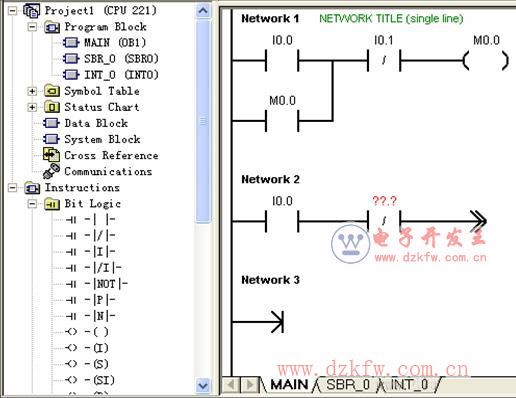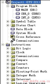新建的程序文件以“項目1(CPU221)”命名,括號內為系統默認plc 的型號。項目包括7 個相關的塊。其中程序塊中有1 個主程序,1 個子程序SBR-0 和1 個中斷程序INT-0。