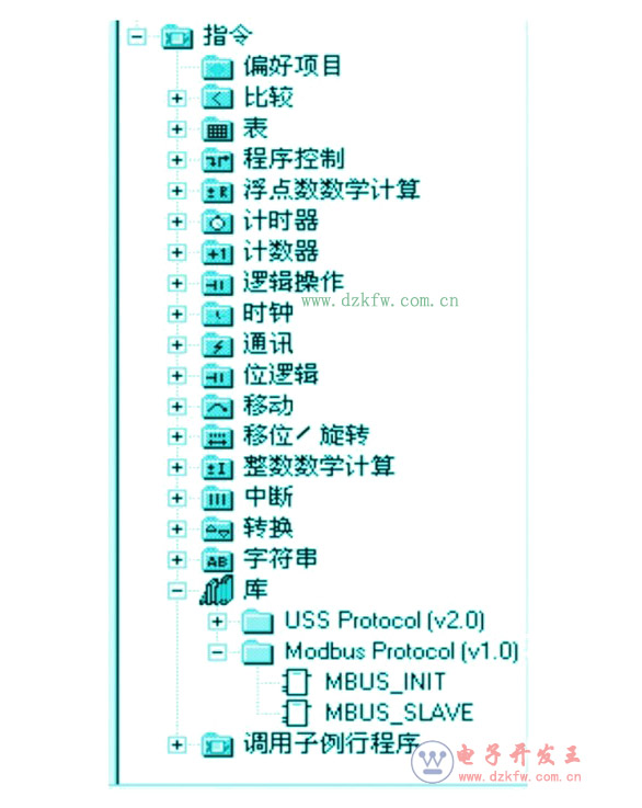 (2) 檢查Micro/WIN的指令樹中是否存在Modbus RTU從站指令庫(圖1),庫中應當包括MBUS_INIT和MBUS_SLAVE兩個子程序。如果沒有,須安裝Micro/WIN32 V3.2 Instruction Library(指令庫)軟件包,如圖1所示。