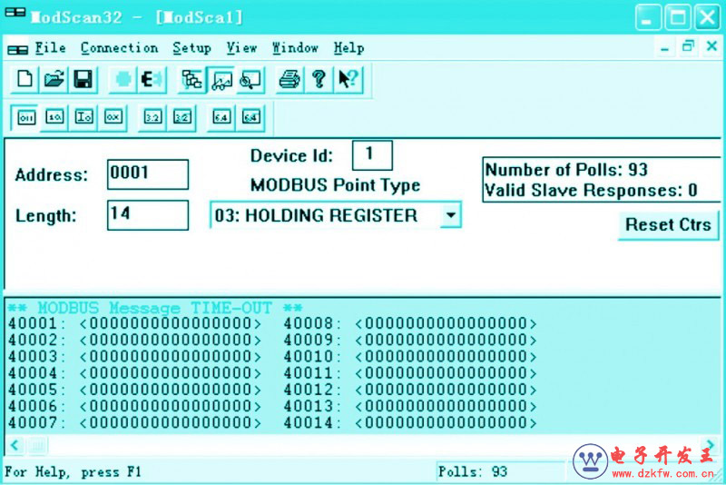 圖3中,ModScan32測試軟件的畫面中相關參數意義如下: