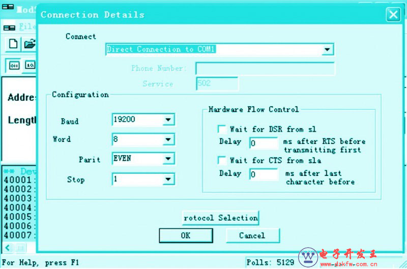 對ModScan32測試軟件的通訊參數進行相關設置,要與S7-200的Modbus RTU指令庫MBUS_INIT中所設定的參數相統一,這樣即可進行通訊檢測。ModScan32通訊參數設置如圖4所示。
