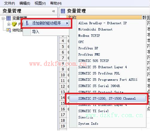 在WinCC項目中可添加此驅動,如圖4. 所示,打開變量管理界面,選擇"變量管理"點擊鼠標右鍵,選擇"添加新的驅動程序",在驅動列表中選擇"SIMATIC S7-1200, S7-1500 Channel"驅動。