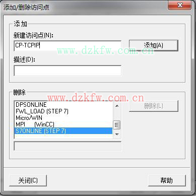 在彈出框中"新建訪問點"填寫"CP-TCPIP",點擊"添加"按鈕添加訪問點,如圖8.所示,完成后關閉對話框。