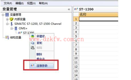 鼠標右鍵"SIMATIC S7-1200, S7-1500 Channel"驅動下"OMS+"選項,選擇"新建連接"新建與S7-1200 PLC的連接。右鍵選擇連接名稱,選擇"連接參數",如圖10.所示。