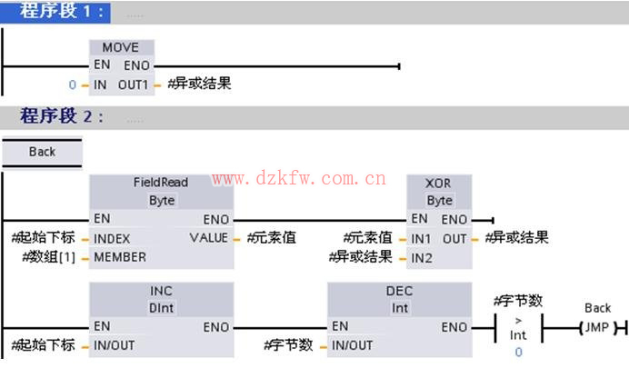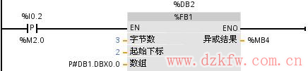 在OB1中調用FB1(見圖2),求DB1中的數組1從下標為2的元素開始的3個數組元素的異或值,異或的結果用MB4保存。