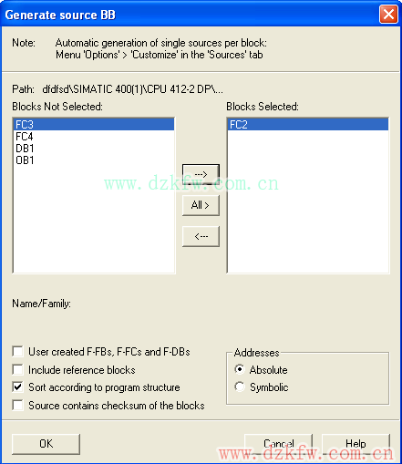 在圖3的界面中左側是未選中的程序塊,右側是已經選中的程序塊。點擊向左或向右的箭頭可以將程序塊在兩側移動。如我們只生成FC2的源文件,只需將FC2移動到右側。點擊確認按鈕就會自動在 “Source”文件夾下生成名字“BB”的源文件。