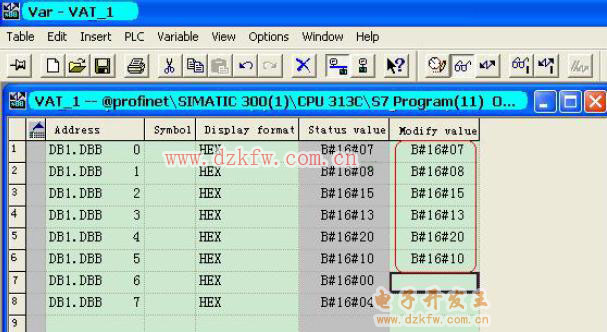 在程序運行后打開監視和修改變量表即可觀察到最后一個字節DB1.DBB7的低4位已經被系統自動計算為4即星期三。