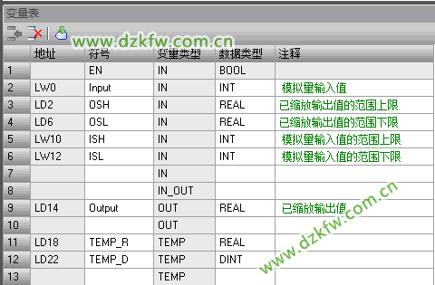 此子例程首先會讀取由調用POU 傳遞的值: 要縮放的輸入、輸入范圍上限 (ISH)、輸入范圍下限 (ISL)、輸出范圍上限 (OSH) 和輸入范圍下限 (OSL)。