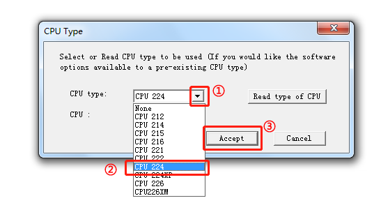 步驟6.鼠標(biāo)點(diǎn)擊倒三角形符號(hào),選擇與編程軟件一致的CPU型號(hào),然后點(diǎn)擊確定,如圖8所示。