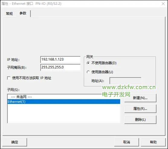 3、創建Ethernet:雙擊上圖中的PN-IO,在彈出的窗體中,選擇屬性>>新建,然后將IP地址修改成192.168.1.123,這里的IP地址是自己設置的,只要和本機在同一網段即可。