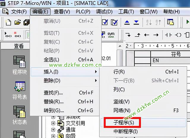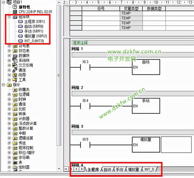 S7-200系列CPU控制程序由主程序OB1、子程序SBRO和中斷程序INTO組成,STEP7-Micro/WIN在程序編輯窗口為每個POU(程序組織單元)提供一個獨立的頁。主程序總是在第一頁,后面是子程序和中斷程序。