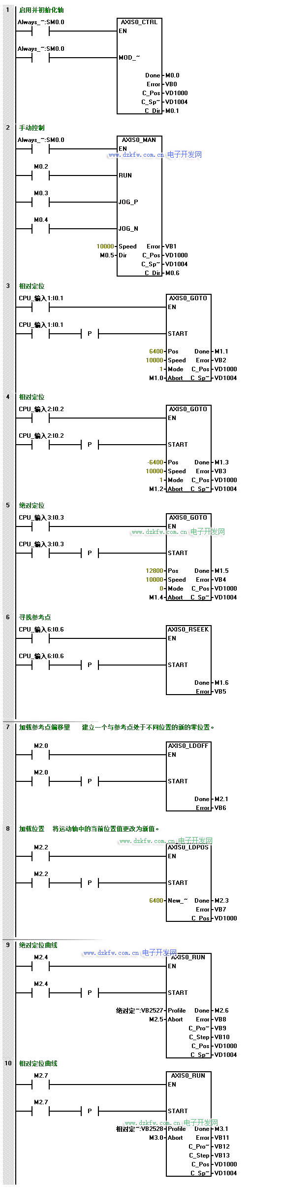 AXISx_CTRL子程序(控制)啟用和初始化運動軸,方法是自動命令運動軸每CPU更改為RUN模式時加載組態/曲線表。在項目中只對每條運動軸使用此子程序一次,并確保程序會在每次掃描時調用此子程序。使用SM0.0(始終開啟)作為EN參數的輸入。