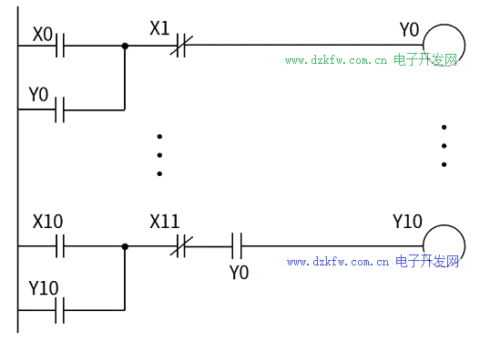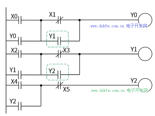 或者Y2不甘寂寞,也要加入互鎖的隊伍,此時Y0、Y1、Y2分別把各自的常閉觸點放到它方的支路構成聯鎖,當Y0、Y1、Y2中任一個輸出為1,其他兩路都不能連通。顯然,參與互鎖的各方不是你死就是我亡,所謂一山不容二虎,它們不可能同時被接通。