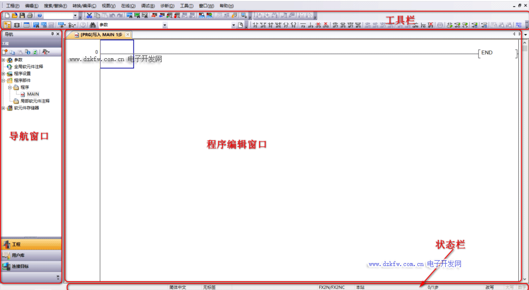 新建工程后會進入程序編輯界面,在該界面中可以實現對程序的編輯、修改以及監視程序的運行狀態。
