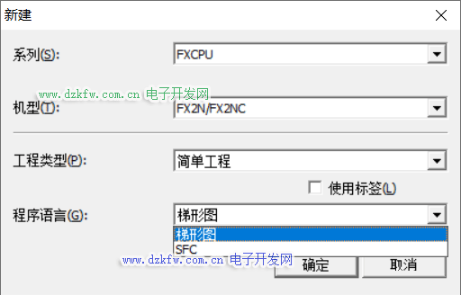 在新建工程界面中可以選擇PLC的系列、機型、工程類型、程序語言以及是否使用標簽等內容(本文以新建簡單工程為例)。