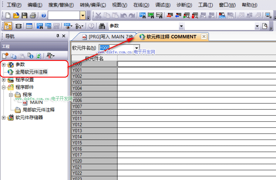 單擊導航窗口中“參數”選項卡下的“全局軟元件注釋”進入軟元件注釋界面。