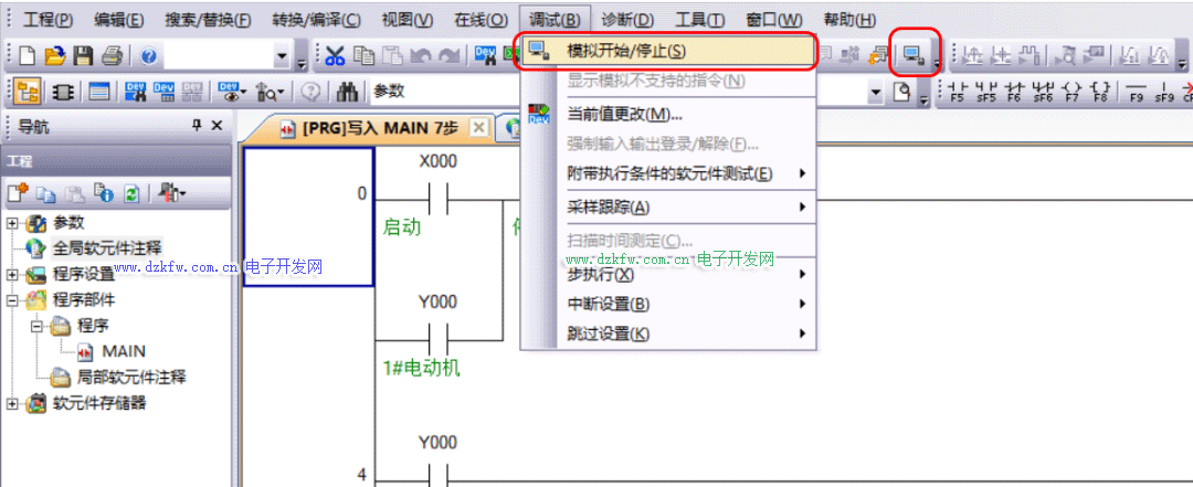 程序轉換/編輯無誤后依次單擊菜單欄中的“調試”——“模擬開始/停止”或直接單擊工具欄中的“電腦”圖標進入仿真模式。