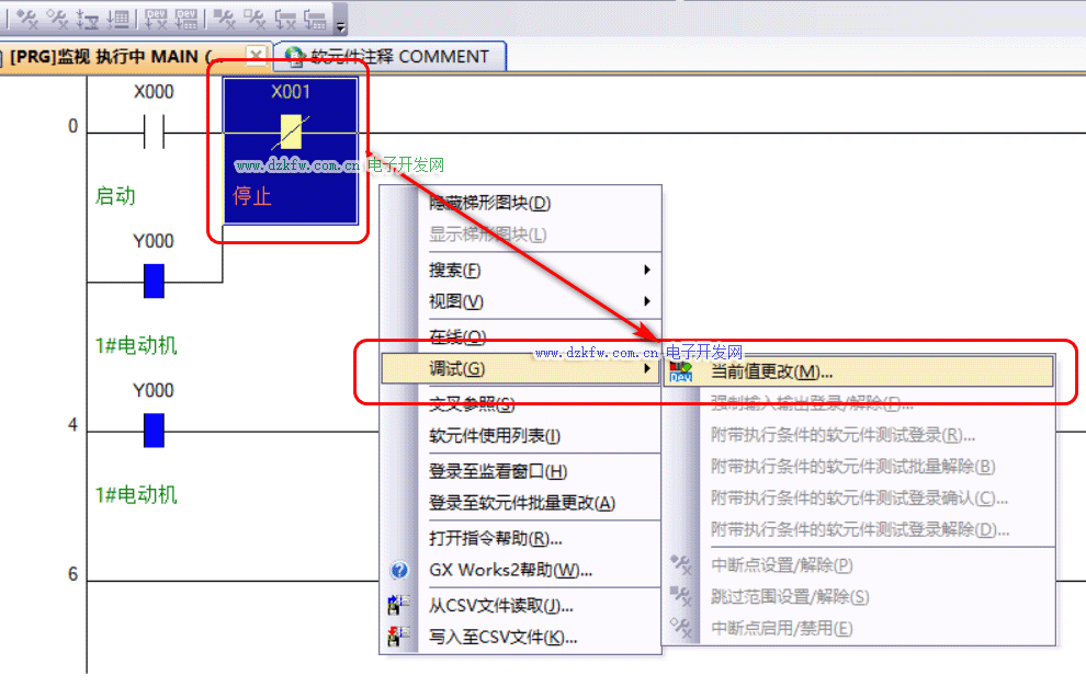 將編輯框移動到需要修改的軟元件上,然后右鍵單擊選擇“調試”——“當前值更改”進入更改界面。