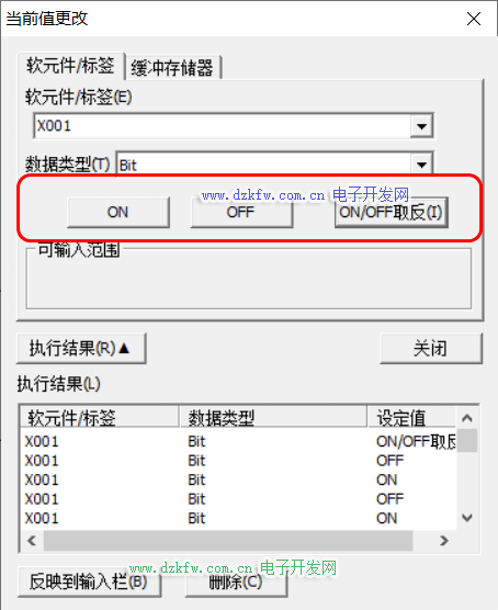 通過單擊“ON”、“OFF”、“ON/OFF取反”按鈕調整軟元件的狀態。