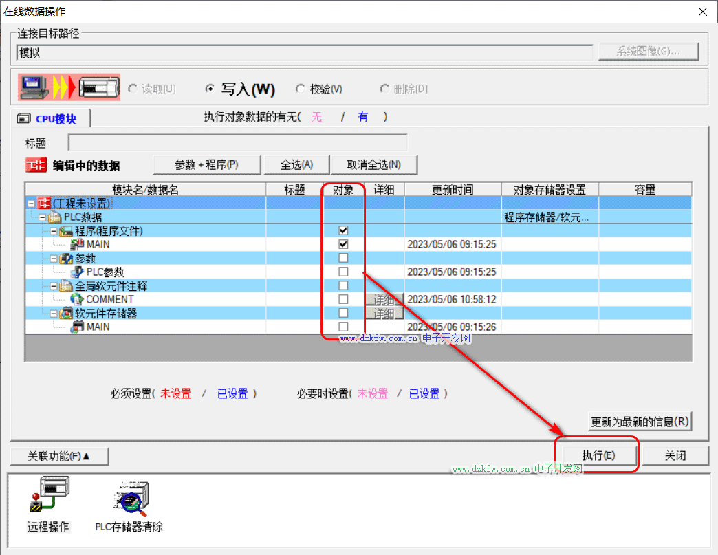需要將修改后的程序下載到仿真器中時,依次單擊菜單欄中的“在線”——“PLC寫入”進入程序寫入界面。在該界面可以根據需要勾選需要寫入到PLC中的內容。