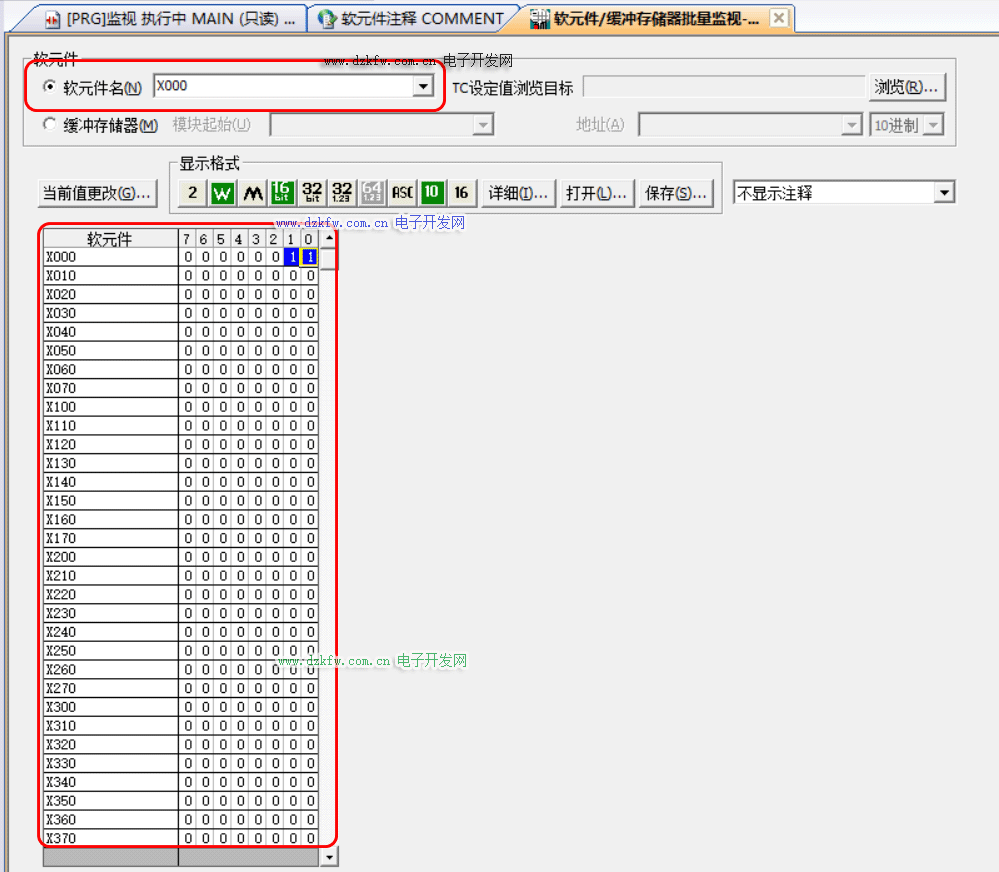 在菜單欄中依次單擊“在線”——“監視”——“軟元件/緩沖儲存器批量監視”進入批量監視界面。
