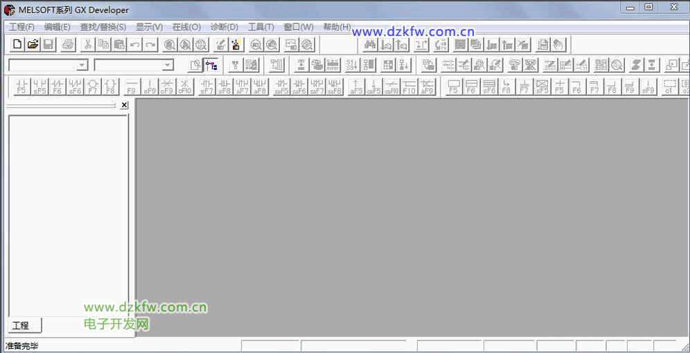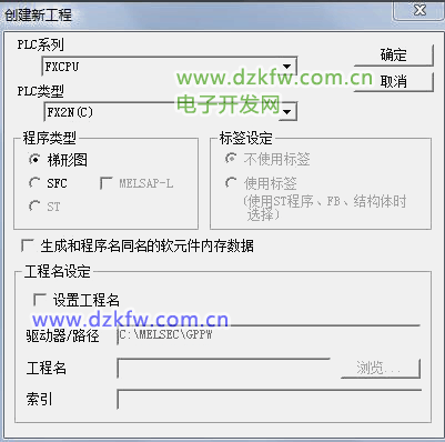 打開菜單欄中“工程-創(chuàng)建新工程”,會彈出“創(chuàng)建新工程”的窗口,可以選擇PLC類型、程序類型和設(shè)定工程名。本文選擇的是FX系列的FX2N,梯形圖。點擊“確定”,就回到主窗口中,開始編寫梯形圖程序,如下圖所示: