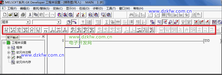接下來就可以 開始編寫PLC梯形圖程序了。我們可以在工具欄中找到相應(yīng)的輸入輸出等符號,點擊就可以添加到程序編輯器中,也可以在編輯器中雙擊左鍵,輸入相應(yīng)的符號,如下圖所示: