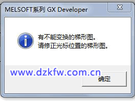 如果程序中有錯誤,變換時會彈出提示窗口,提示“有不能變換的梯形圖,請修正光標(biāo)位置的梯形圖”,如下圖所示: