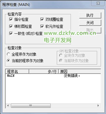 修正程序確認(rèn)無誤后,變換,然后可以點擊工具欄中的“工具-程序檢查”,彈出“程序檢查”的窗口,其中可以對“指令、雙線圈、梯形圖、軟元件和一致性”進行檢查,點擊“執(zhí)行后”,就可以進行檢查了,檢查完畢后,會在下方的信息窗口中給出提示,如下圖所示: