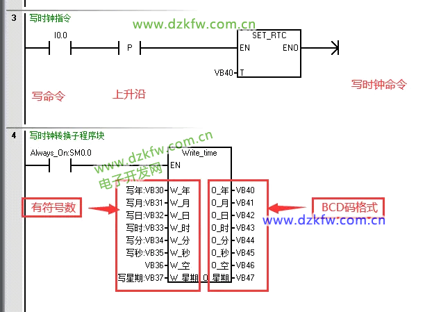 由于寫時鐘是把有符號數寫入200SMART PLC的CPU中,時鐘在CPU內是以字節BCD碼的格式存在,讀時鐘是把8位BCD碼的字節轉換成16位BCD碼的字,再把16位BCD碼的字轉換成16位有符號數,再把16位有符號數轉換成8位有符號數的字節。