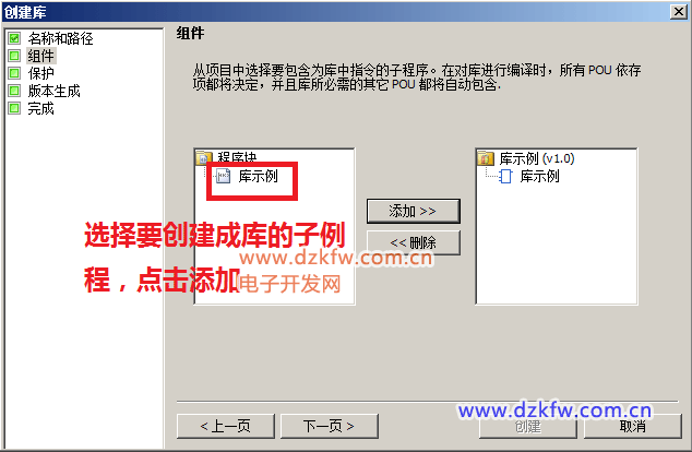 2)創(chuàng)建庫文件:在左側指令樹中找到“庫”右擊彈出對話框,選擇“創(chuàng)建庫”如左下圖,彈出右下圖對話框:選擇需要建立庫的子程序“指示燈延時啟動”,點擊“添加”;選擇“屬性”對庫進行命名以及指定庫文件存儲位置;選擇“保護”,可以對庫文件設置一個密碼保護,可以限制閱讀和修改庫程序。設置好后確定,將會在知道目錄下生成一個庫文件。