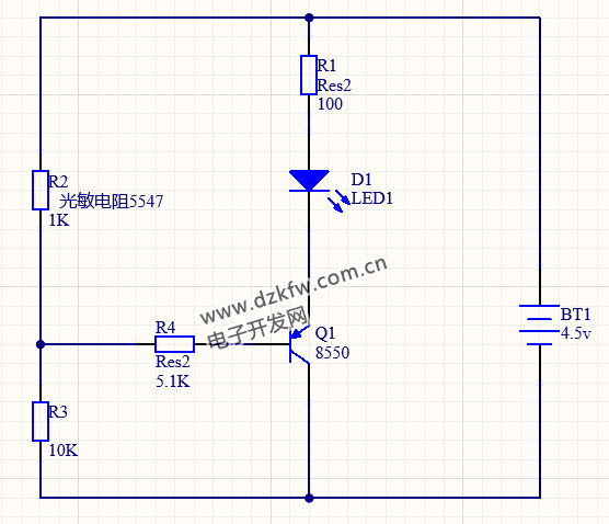 今天跟隨b站的視頻簡單的畫出一個光敏小電燈,從前面學到的先從創建項目再到創建原理圖、PCB圖、原理圖庫和PCB庫,最后在原理圖文件中利用系統自帶的原理圖庫中的元器件畫出此圖。