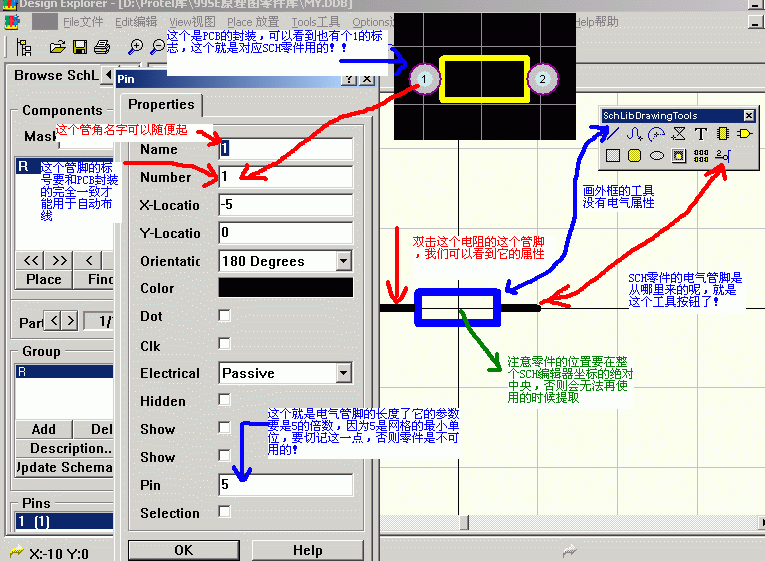 3.先以做一個(gè)SCH電阻零件為例子說明一下,請(qǐng)注意看圖中所有的中文注釋!