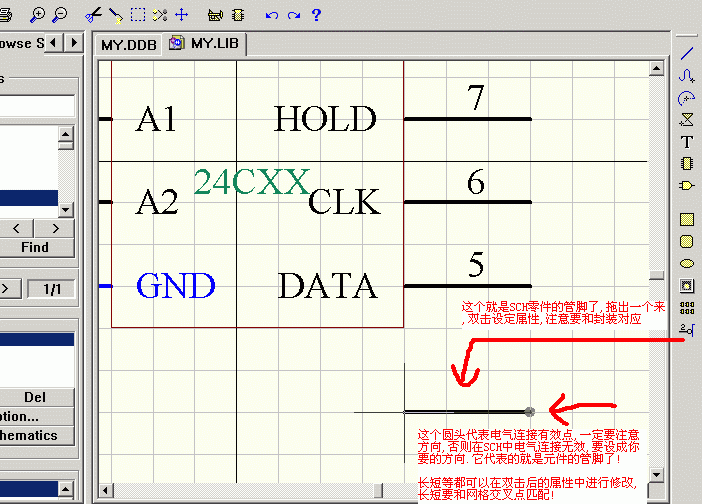 4.要注意SCH零件的管腳的電氣連接有效點(diǎn)是有講究的!仔細(xì)看一下下面這個(gè)圖,注意看中文注釋!