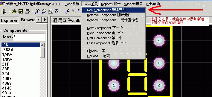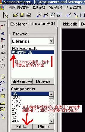 1.打開(kāi)在前幾課已經(jīng)做過(guò)的PCB,選擇那個(gè)我給大家提供的封裝庫(kù),然后按著圖選擇編輯按紐就進(jìn)入了PCB封裝編輯器