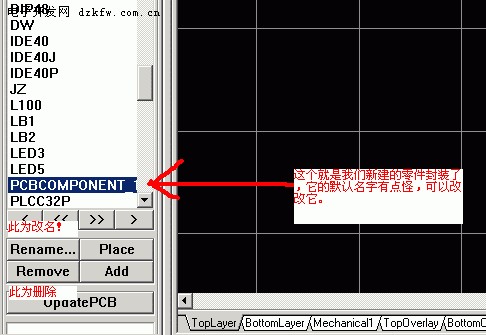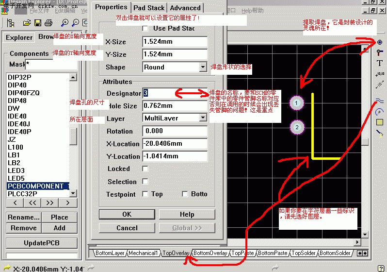 9.可以開(kāi)始做封裝了,注意哪些中文注釋?zhuān)诵膯?wèn)題就是焊盤(pán)的名稱(chēng),但愿你還記得做SCH零件的重點(diǎn)>>