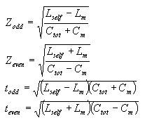 為便于分析,差分線對常常根據它的奇模和偶模阻抗和延遲來描述,而這些與其差模和共模對應的部分是密切相關的,因此可以用方程1 來計算。