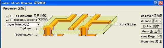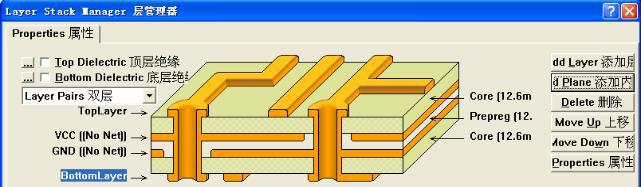 現在我們來添加層,先單擊左邊的TopLayer, 再單擊層管理器右上角的Add Plane按鈕,添加內電層,這里說明一下,因為現在講的是用負片畫法的四層板,所以,需要添加內電層,而不是Add Layer。