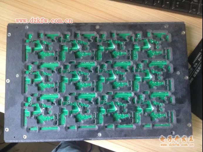 圖片中就是所謂的治具,通過一塊特殊的擋板,把貼片元器件擋住,只讓直插件的引腳露出,然后進(jìn)行波峰焊接。但是前提條件是貼片元器件和直插件的距離足夠的遠(yuǎn),而且這塊治具的成本并不低。