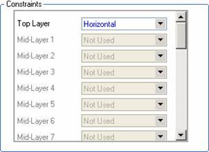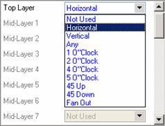 各種布線方法為: Not Used 該層不進行布線; Horizontal 該層按水平方向布線 ;Vertical 該層為垂直方向布線; Any 該層可以任意方向布線; Clock 該層為按一點鐘方向布線; Clock 該層為按兩點鐘方向布線; Clock 該層為按四點鐘方向布線; Clock 該層為按五點鐘方向布線; 45Up 該層為向上 45 °方向布線、 45Down 該層為向下 45 °方法布線; Fan Out 該層以扇形方式布線。