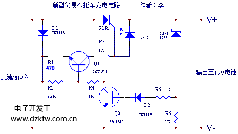 該充電器只利用了交流電的正半周充電,充電速度較快,且能延長電池壽命,在普通的么托車上使用該充電器,性能極好,可省燃油5%左右,是一個實用的充電電路,此充電器的作者正在使用中。工作原理:(如下圖)交流電壓同時加到D1和SCR,經過D1的半波整流后通R1、R2、Q1、R3向SCR提供觸發電壓,此時SCR給電池充電,當電池電壓上升至13.5V時ZD1導通,電壓經過R5、D2向Q2提供偏壓,使Q2導通,Q1反偏截止,SCR停止輸出,當電池電壓低于13-13.5V時,將重復上述過程。