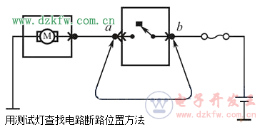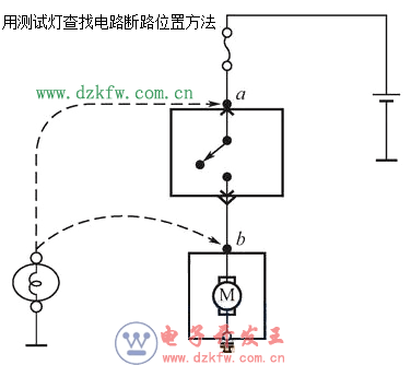 將測試燈的一根引線搭鐵,另一根引線連接到開關(guān)插接器電源側(cè)端子上,即下圖中a點位置,測試燈應(yīng)點亮;然后將測試燈連接到電機插接器上,即下圖中b點位置,若將開關(guān)打開,測試燈不應(yīng)點亮;若將開關(guān)閉合,測試燈應(yīng)點亮,否則開關(guān)及開關(guān)到電動機插接器之間的線路斷路。