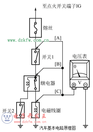 C:點火開關置于ON位置、開關1打開、繼電器接通(連接繼電器)且開關2關閉(或斷開開關2)。