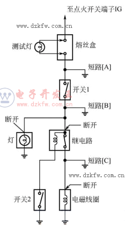 拆下熔斷的熔絲,斷開熔絲的所有負載,在熔絲處連接測試燈,創建使測試燈點亮的條件(下圖)。