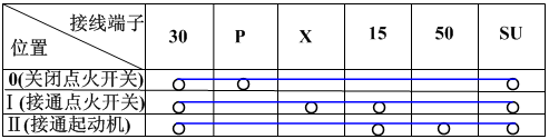 其中:30-接蓄電池 P-接停車燈 X-接卸荷工作電源 15-接點火電器 50-接起動機 SU-接蜂鳴器電源