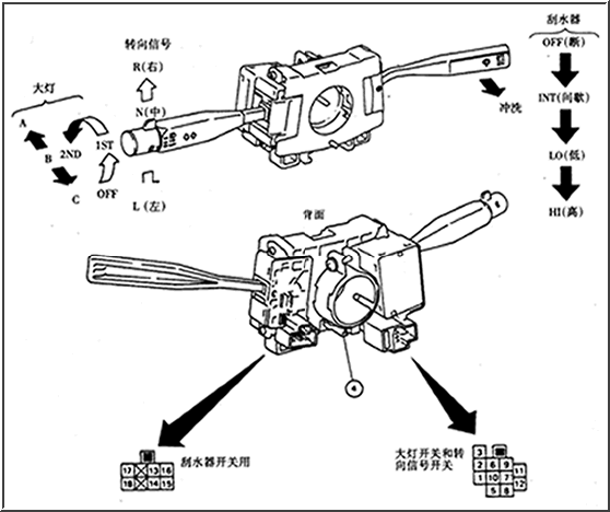 結構:如圖4所示。該開關通過不同的手柄和同一手柄不同的運動方式,實現對大燈的遠近光切換、轉向燈電路和刮水、洗滌電路的控制。