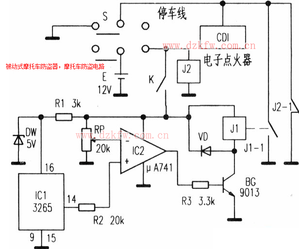 工作原理:下圖中,S為車鎖,CDI為摩托車電子點(diǎn)火器。其它為附加電路。圖示中S為停車狀態(tài),S的常閉觸點(diǎn)將CDI的停車線接地,車子便不能發(fā)動(dòng)。IC1是一只加速度傳感器3265,該傳感器為16腳DIP封裝,5V供電,輸出信號(hào)電壓為0.5V~4.5V。 IC2為一只運(yùn)算放大器,其反相輸入端電位由RP偏置在略高于2.5V。