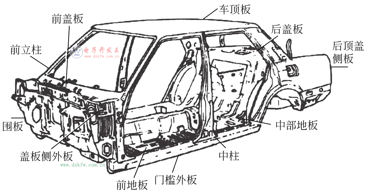 乘坐室和行李廂焊接在一起形成主車身,它們由圍板、地板和頂板等組成