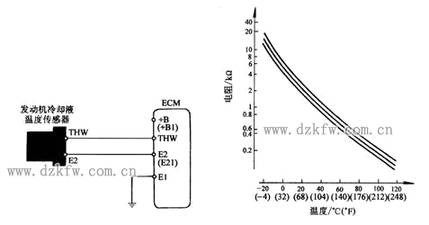 圖2-17 水溫傳感器的接線及特性曲線(豐田)
