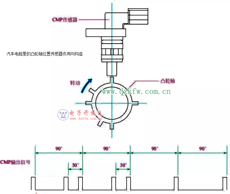 當凸輪軸上的凸起物在凸輪軸的旋轉作用下經(jīng)過CMP 傳感器的電磁閥時,它們會導致磁通量發(fā)生變化。CMP 傳感利用處理電路將磁通量的變化轉換為數(shù)字波形(矩形波)。ECU 根據(jù)凸輪軸位置波形檢測發(fā)動機轉速和凸輪軸位置。