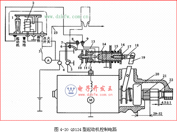 接觸盤將電動機開關接柱19、21連通后,電動機電路接通。此電路電阻極小,電流可達幾百安培,電動機產(chǎn)生較大轉(zhuǎn)矩,帶動飛輪轉(zhuǎn)動。電動機開關接通后,吸引線圈和附加電阻被短路。